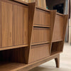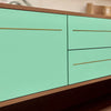 With Brass Pulls and InlaysOur Clara console is inspired in the Art Deco style and can easily be used as an entry table, console or dry bar. Made of rift sawn white oak and oak veneer and has our mint white finish to soften the natural yellow of the white oak. It has sliding doors featuring inset perforated metal panels in the color cream. The composite top. Sliding doors featuring smooth ball bearing glides. Soft close drawers. Solid antique brass pulls. Matching brass inlays running horizontally along the toe kick and rounded corners.