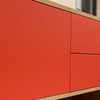 With Raucous OrangeDouble sink base. Fronts in the raucous orange color. White oak plywood construction. Horizontal grain direction. Radius corners. Long cubbie. Drawers in painted baltic birch with rose decal at the bottom and push to open hardware.