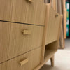 Double sink base. Angled fronts. White oak plywood construction. Vertical grain direction. Awning doors. Drawers in solid white oak, dovetail joinery and push to open hardware.
