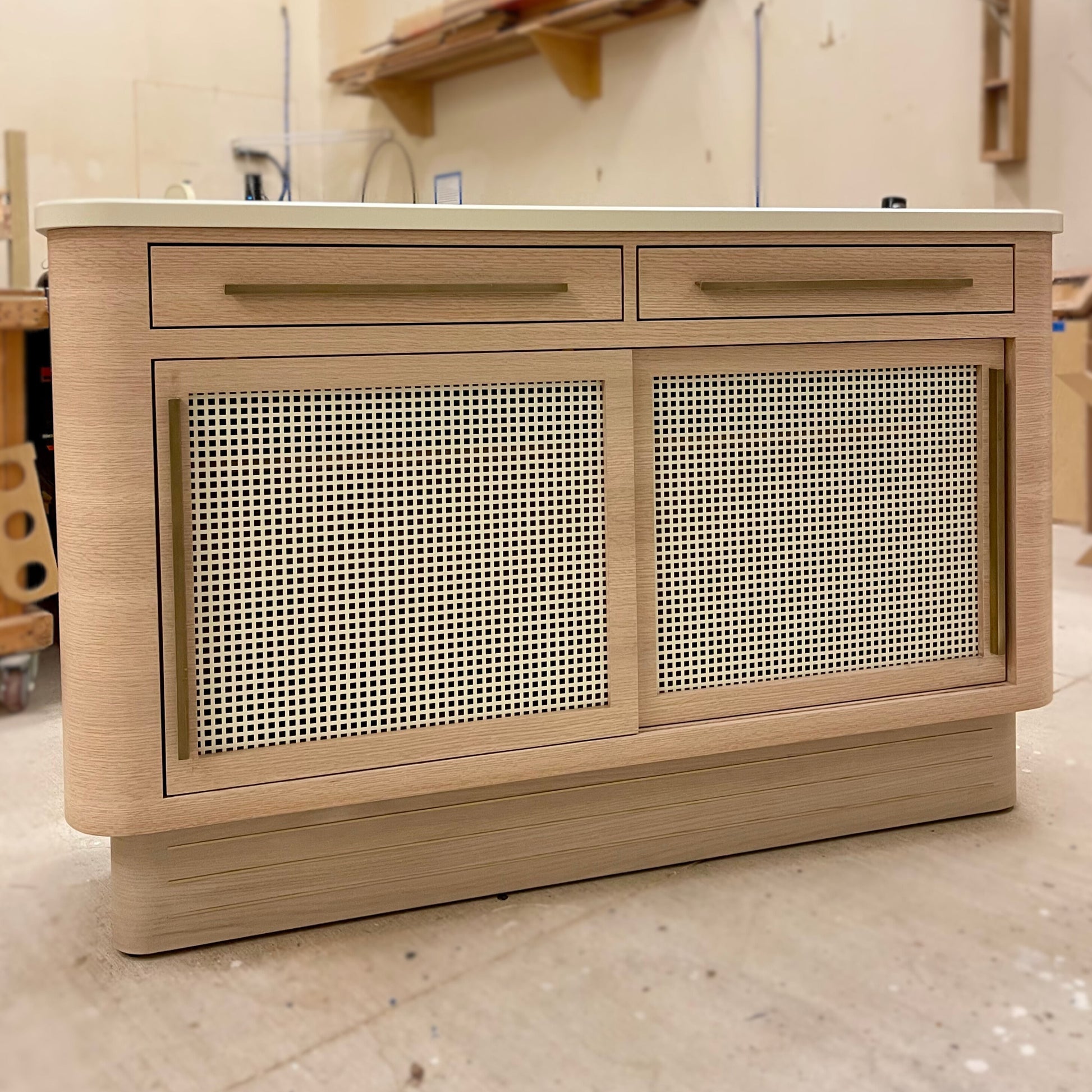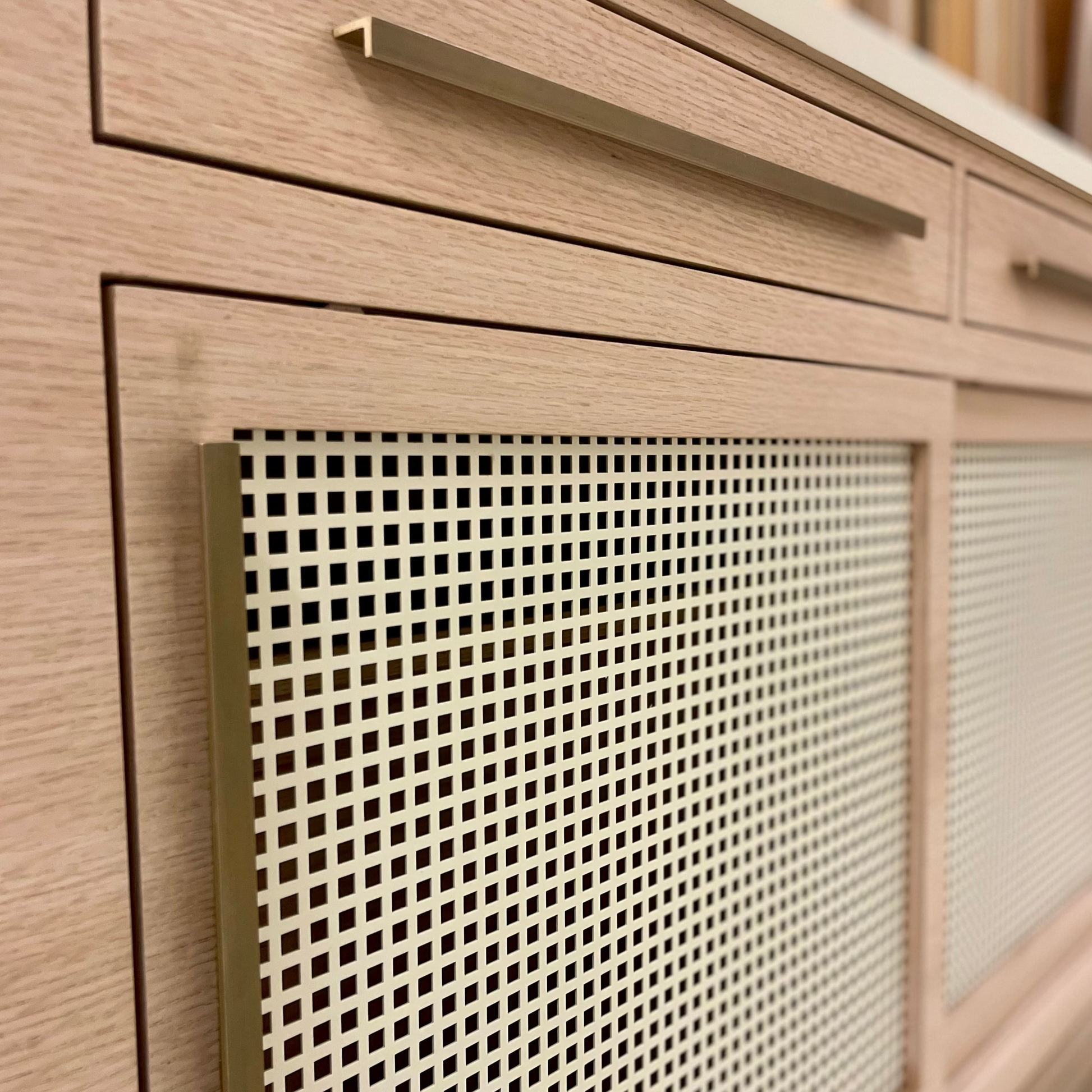 Our Clara console is inspired in the Art Deco style and can easily be used as an entry table, console or dry bar. Made of rift sawn white oak and oak veneer and has our mint white finish to soften the natural yellow of the white oak. It has sliding doors featuring inset perforated metal panels in the color cream. The composite top. Sliding doors featuring smooth ball bearing glides. Soft close drawers. Solid antique brass pulls. Matching brass inlays running horizontally along the toe kick and rounded corners.